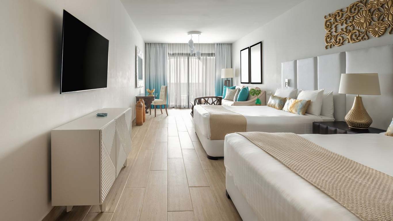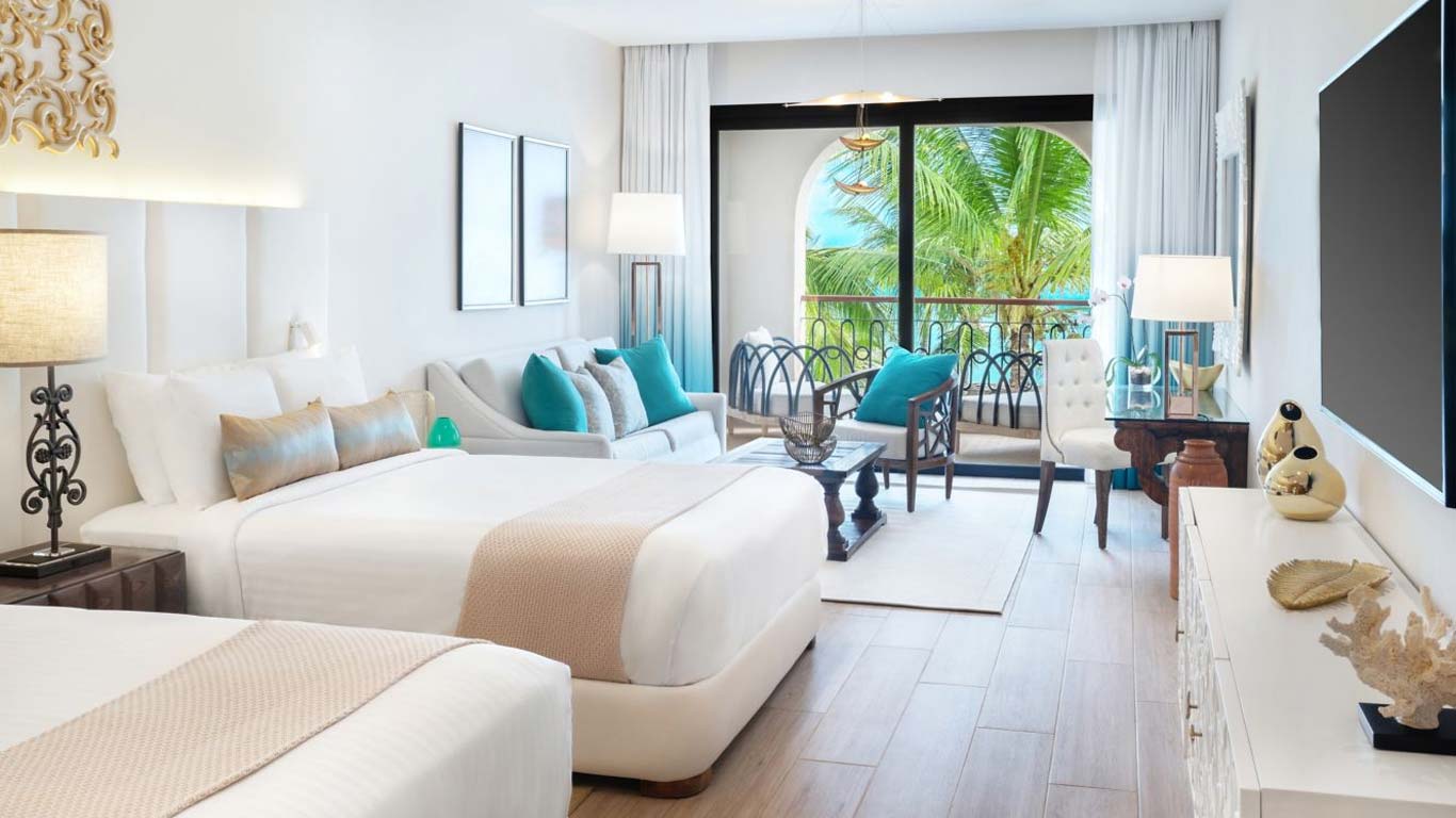 The Luxury Junior Suites at Sanctuary Cap Cana includes 2 double beds, a full bathroom with a rain shower, living area and a private balcony with garden views.