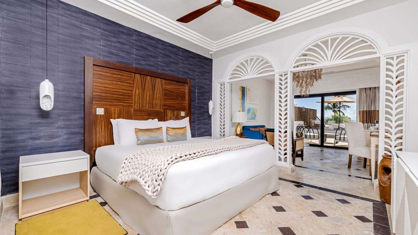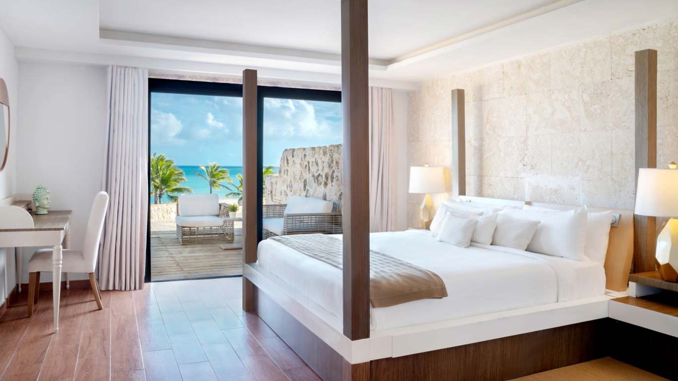 The Ocean View Premium Junior Suites at Sanctuary Cap Cana includes a king bed and full bathroom plus furnished living room, terrace and private hot tub.